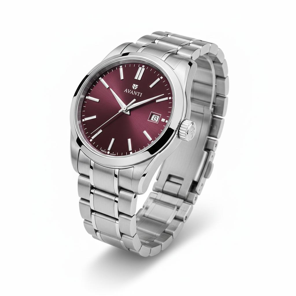 This is a contemporary dress watch from Avanti, characterized by its striking balance of minimalist design and bold color. It features a deep burgundy (wine red) dial with a “sunray” finish, which catches and reflects light from the center outward