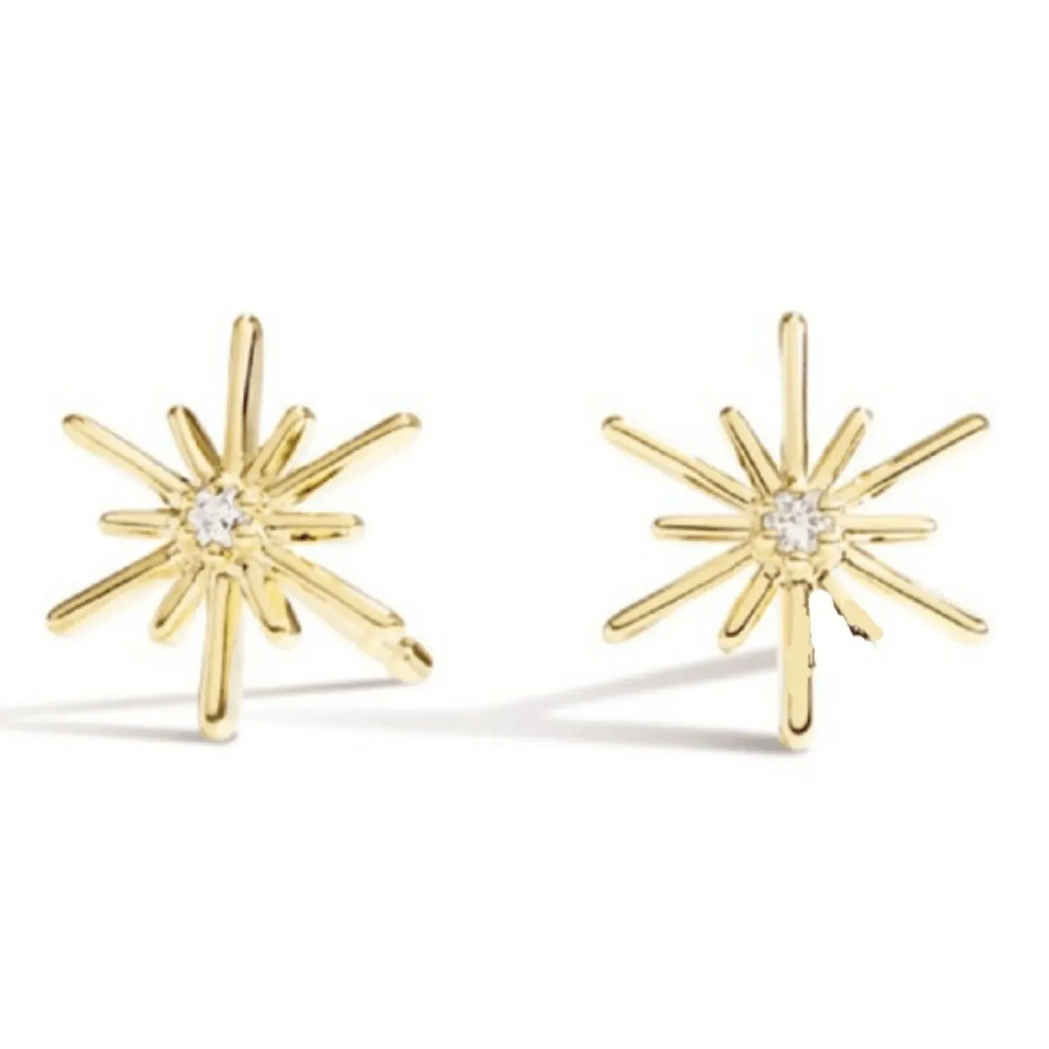 Illuminate your look with these radiant starburst stud earrings. Crafted in a gold-tone finish, the intricate design features multiple rays emanating from a center single cubic zirconia stone, adding a delicate sparkle. Perfect for a touch of everyday cosmic charm.