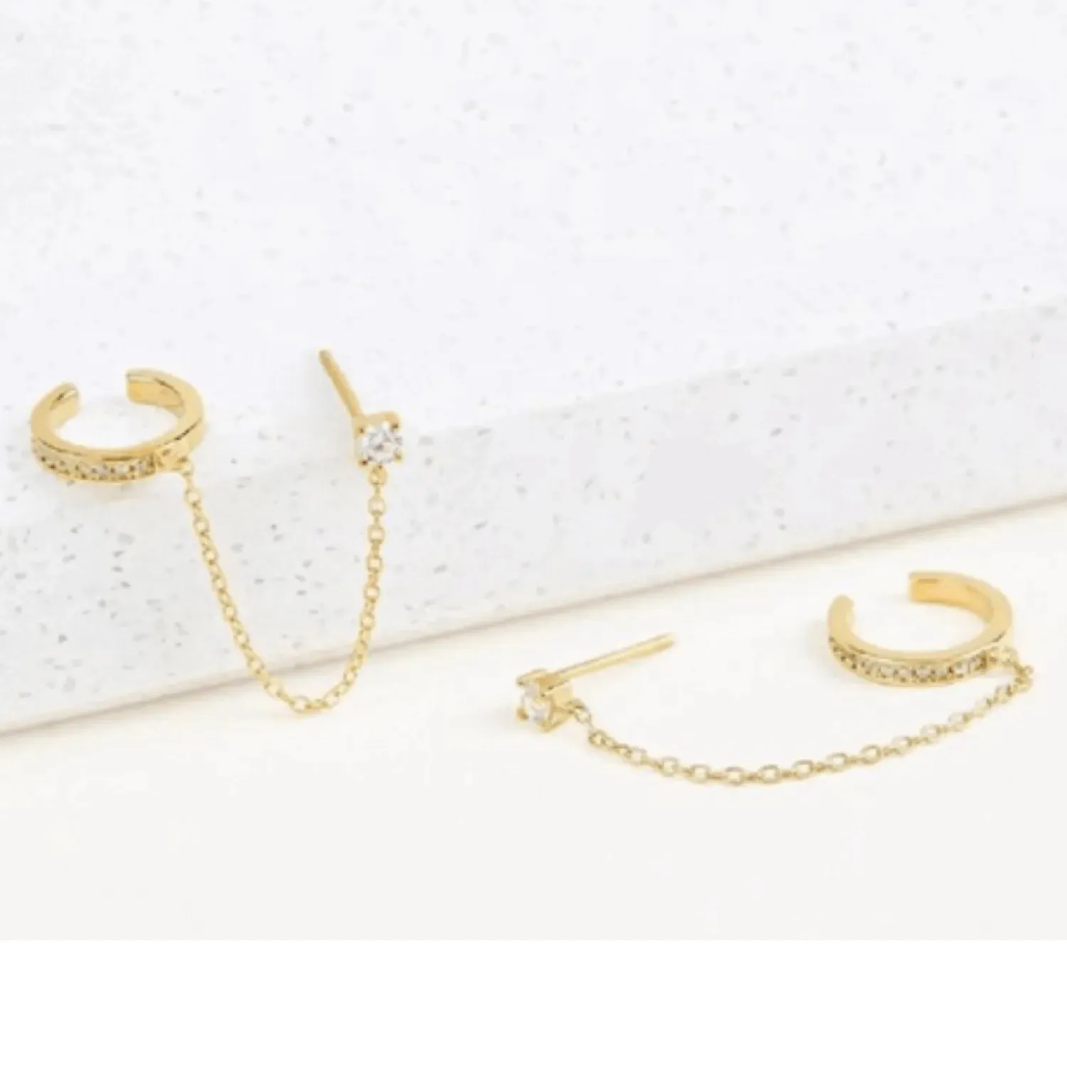 Create an effortlessly cool, multi-piercing look with this chained set. It features a single stone stud earring connected by a delicate chain to a pave-set ear cuff, all in a gold-tone finish. Perfect for an edgy, layered style.