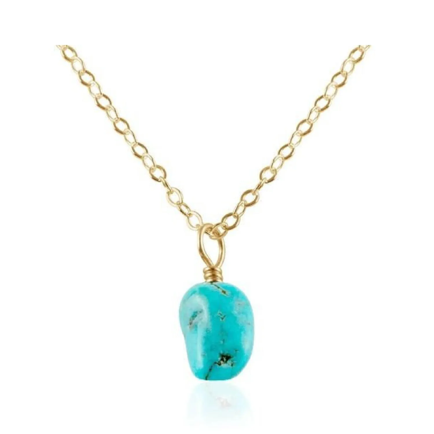 A minimalist and organic gold-tone chain necklace featuring a single, freeform tumbled turquoise nugget wrapped with a simple gold wire.
