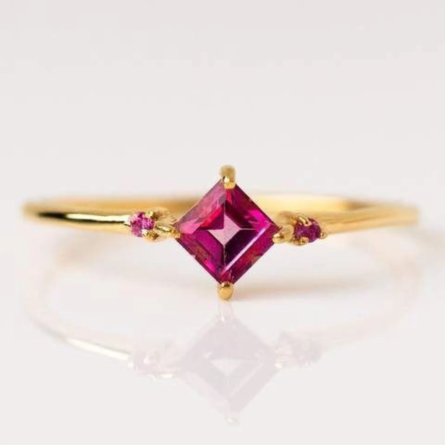 A delicate gold ring featuring a central, square-set (princess-cut) vibrant pink/magenta gemstone (likely Ruby or Rhodolite Garnet) set diagonally, flanked by tiny round gemstone accents.