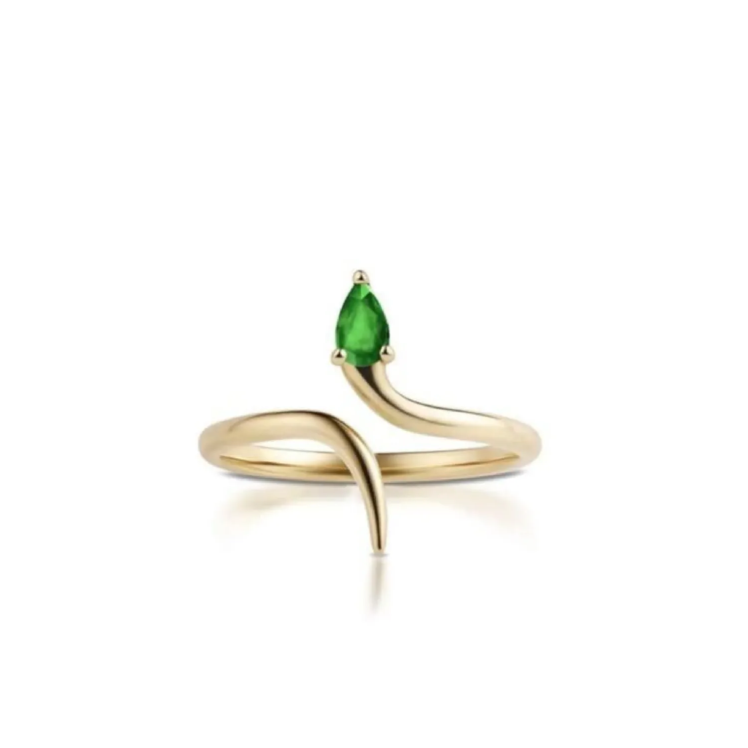 An artistic gold bypass ring with a fluid, snake or serpent-like design, featuring a pear-cut brilliant green gemstone (likely Emerald or Green Tourmaline) set at the head.