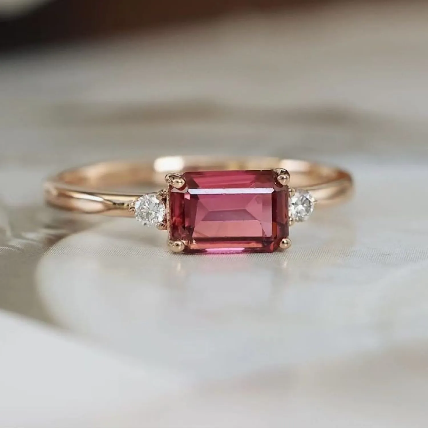 A classic yet modern rose gold ring featuring a prominent rectangular (emerald-cut) pink tourmaline flanked on either side by a brilliant-cut diamond accent.