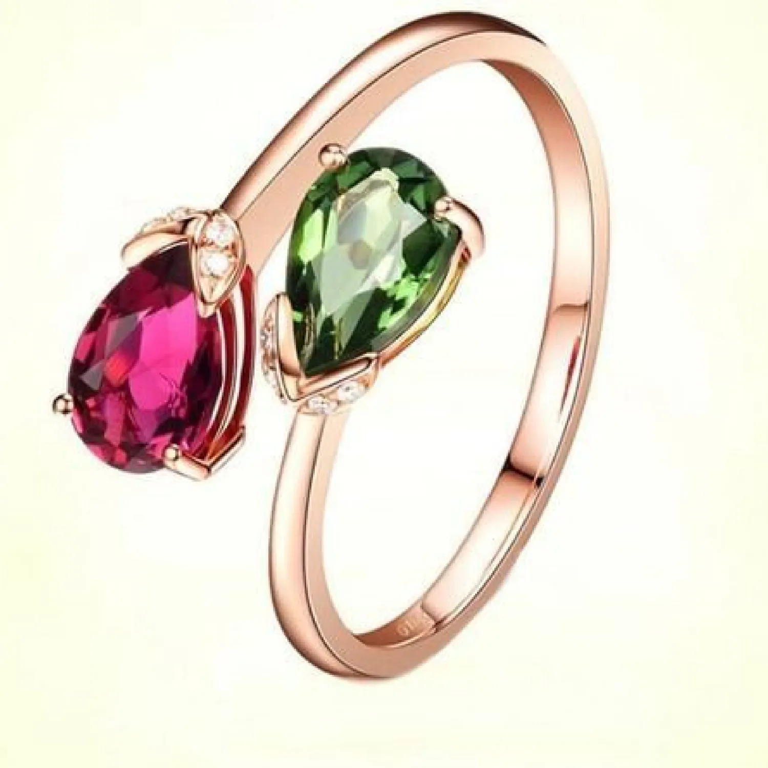 A striking rose gold bypass-style (“Toi et Moi”) ring showcasing two contrasting pear-cut gemstones: a brilliant magenta (Rubellite Tourmaline) and a striking green (Green Tourmaline/Peridot), with small diamond accents.