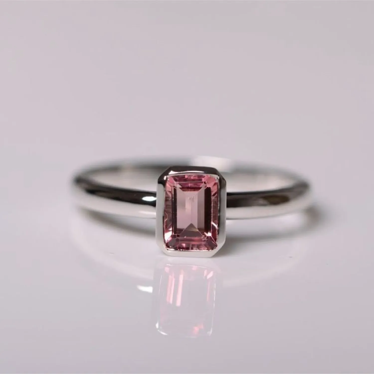 A modern ring in polished sterling silver (or white gold) featuring a clean, sleek band and a bezel-set rectangular (emerald-cut) pink tourmaline gemstone.