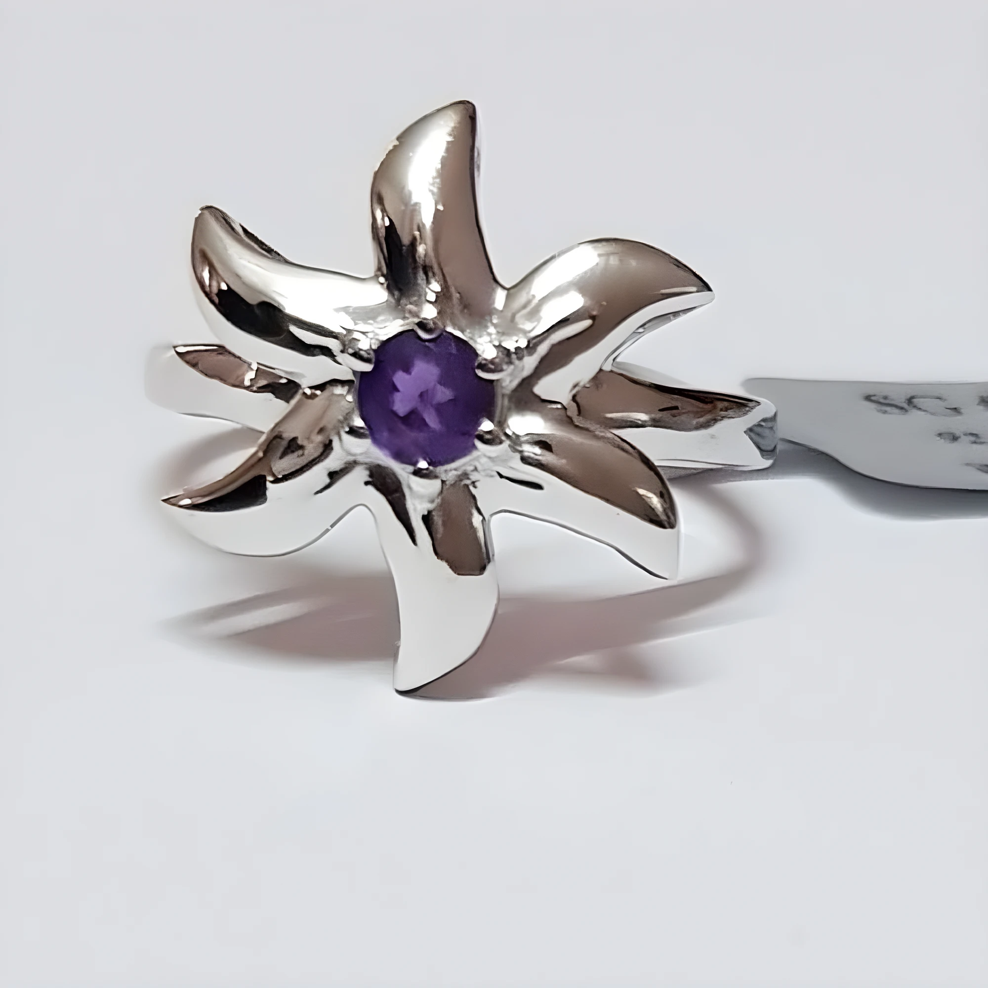 A unique sterling silver ring is captured in a close-up, featuring a sculptural flower design with six polished silver petals radiating outwards. At the center of the flower, a round-cut amethyst gemstone, specified as 3×3 mm, adds a pop of rich purple color. The polished silver petals reflect light beautifully, creating a dynamic and stylish look. A tag is partially visible behind the ring. The ring is listed as weighing 2.4 grams, and the white background emphasizes the intricate design and the central gemstone.