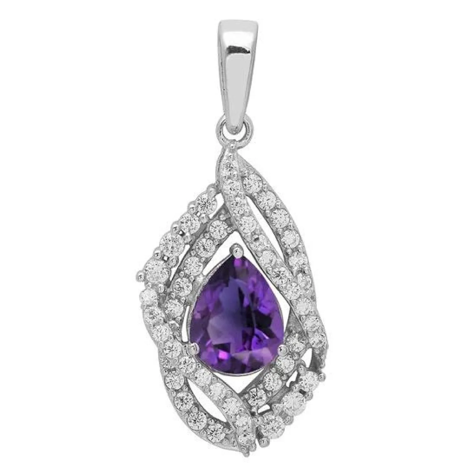 This exquisite pendant features a rich pear-cut natural Amethyst gemstone as its focal point. The vibrant purple stone is beautifully enhanced by a swirl of sterling silver ribbons, all adorned with sparkling cubic zirconia accents.