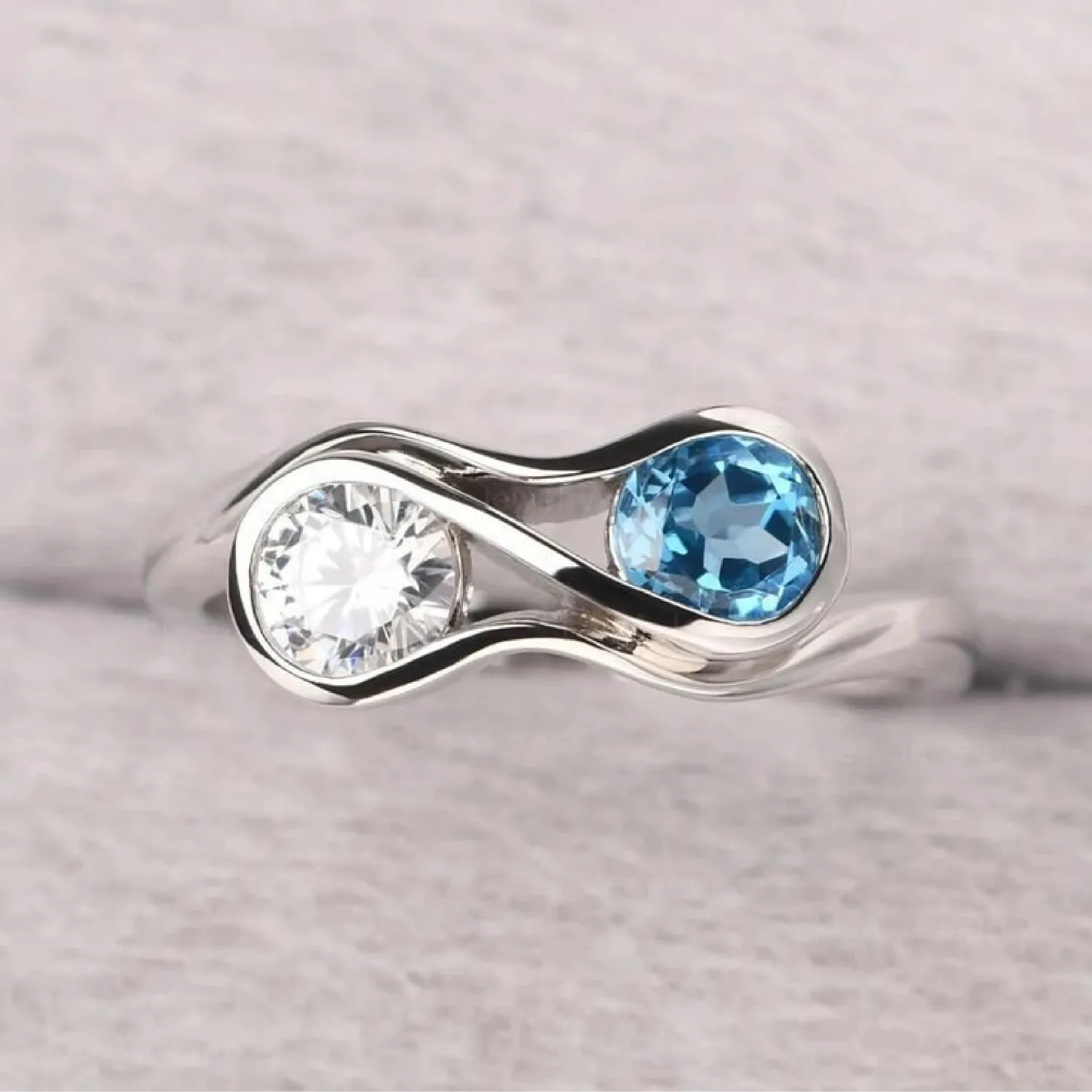 A graceful white gold bypass ring (Toi et Moi) featuring a round-cut brilliant white diamond or cubic zirconia and a round-cut light Blue Topaz, set in swirling bezels.